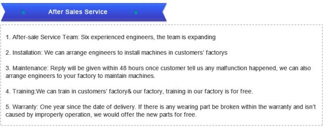 A4: All the equipment ordered from us will provide one year guarantee from the delivery date .If there is any wearing part be broken within the warranty and isn’t caused by improperly operation then we would offer the new parts for free.