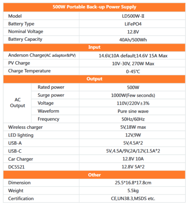 Battery Model LD500W Nominal Capacity: 40Ah/500Wh